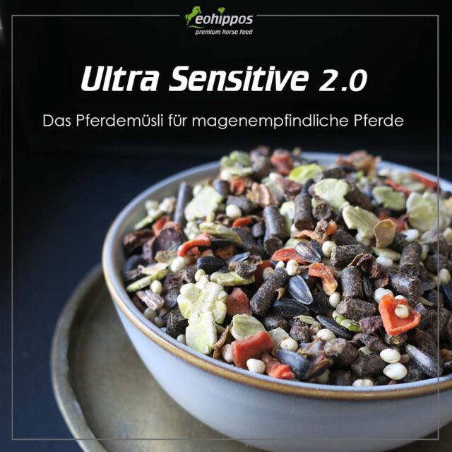 Eohippos Ultra Sensitive 2.0 – hochwertiges, getreidefreies Gastro-Pferdefutter mit besonders niedrigem Stärke- und Zuckergehalt für eine vollwertige Versorgung und maximale Nährstoffdichte.